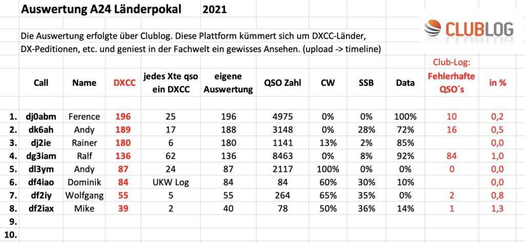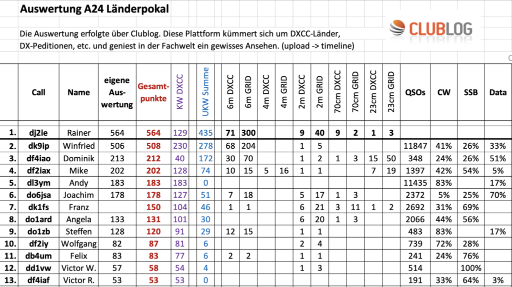 Als KW wird der Bereich unter 30 MHz angesehen. Es zählt jedes gearbeitete DXCC-Land (Datenbasis CLUBLOG), einmal, egal auf welchem Band. Großfelder werden nicht gezählt.